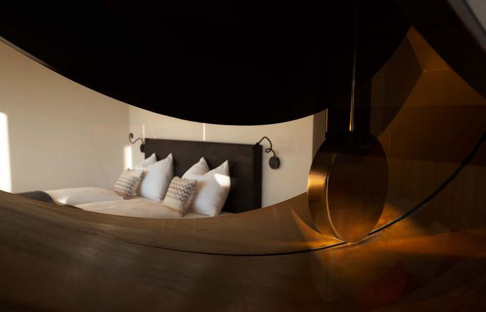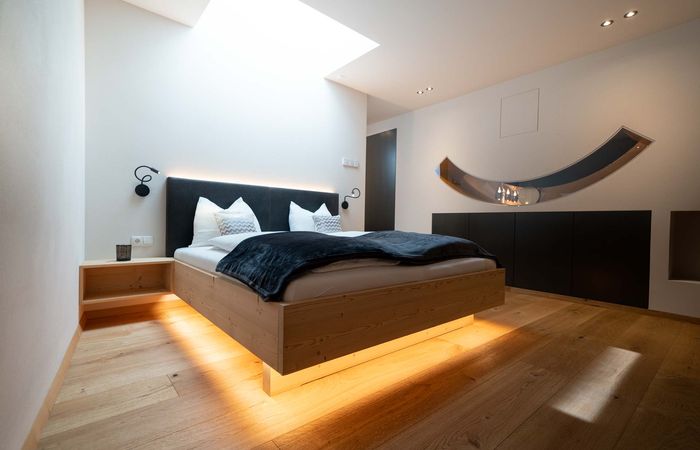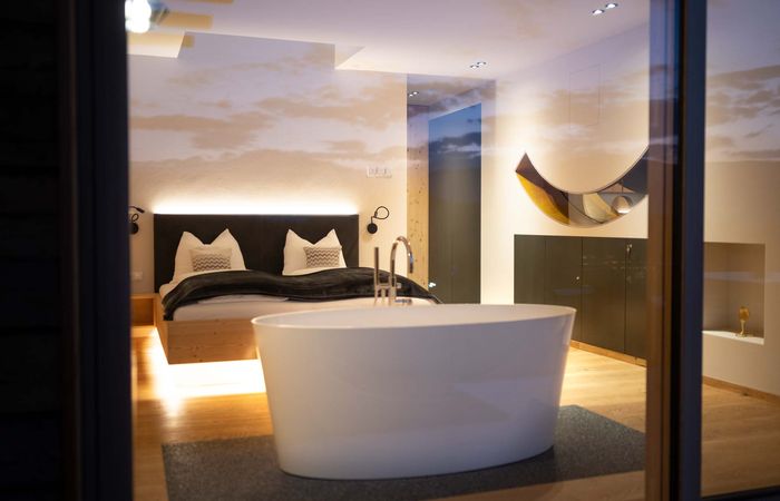 Beim Einschlafen durch das Sky-Glasdach direkt in den Sternenhimmel schauen und am Morgen mit dem spektakulären Blick auf die Bergwelt aufwachen. Erleben Sie weitere genussvolle Momente im großzügigen Privatgarten vor den Chalets, unter der Regendusche mit Panorama-Glasdach und in der freistehenden Badewanne. Entschleunigung und Ruhe sind in der gesamten stimmungsvollen Einrichtung der Chalets wiederzufinden, wie das Pendel in der Trennwand als Symbol für Balance und Ausgleich.