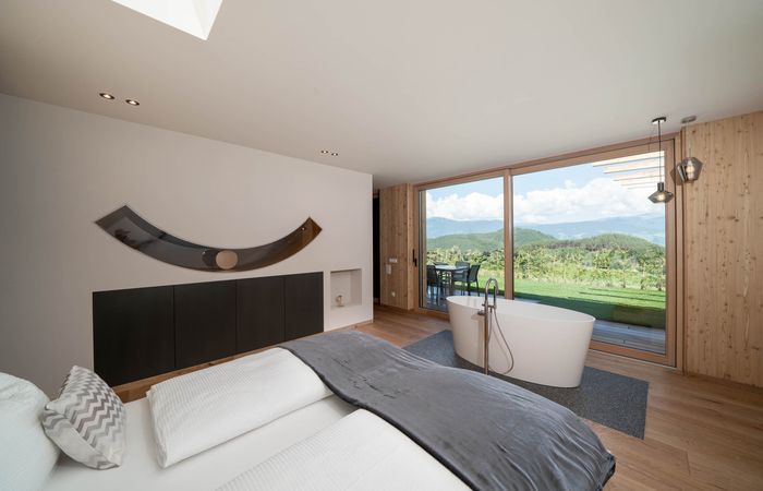 Großer Schlafbereich mit Doppelbett und Sky-Glasdach sowie freistehender Badewanne mit Panoramablick.