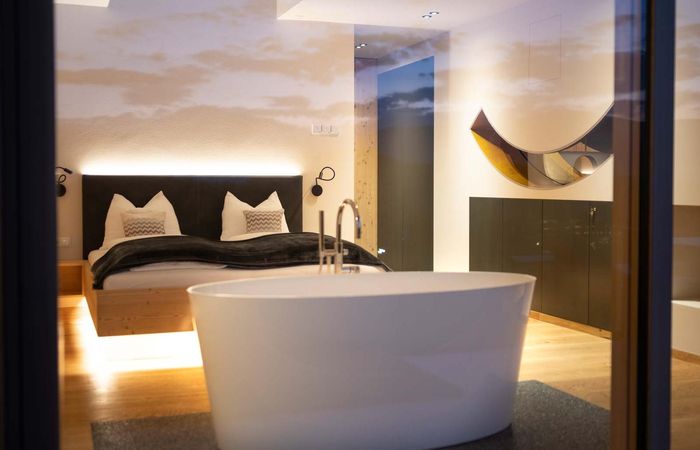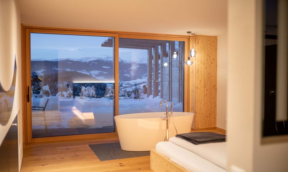 Guardare il cielo stellato attraverso il tetto in vetro prima di addormentarsi e, il mattino, svegliarsi al cospetto dello spettacolare panorama sul mondo alpino: scoprite tutti i piacevoli momenti nell’ampio giardino privato davanti agli chalet, sotto la doccia con tetto panoramico in vetro e nella vasca freestanding. Ritmi pacati e pace si rispecchiano nell’intero e suggestivo arredamento degli chalet, come il pendolo nella parete divisoria, simbolo di equilibrio e bilanciamento.
